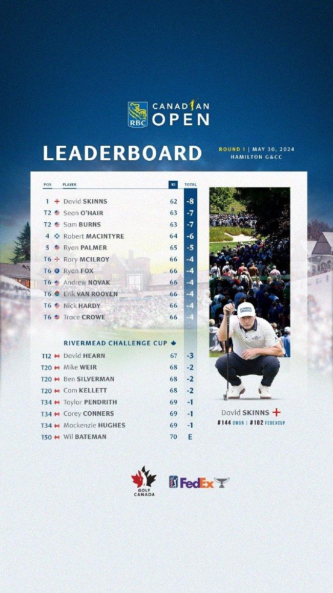 北京時間5月31日,大衛-斯金思(David Skinns)在7個洞的區間中抓到6只小鳥,星期四在漢密爾頓高爾夫鄉村俱樂部打出62桿,低于標準桿8桿,取得RBC加拿大公開賽首輪領先。