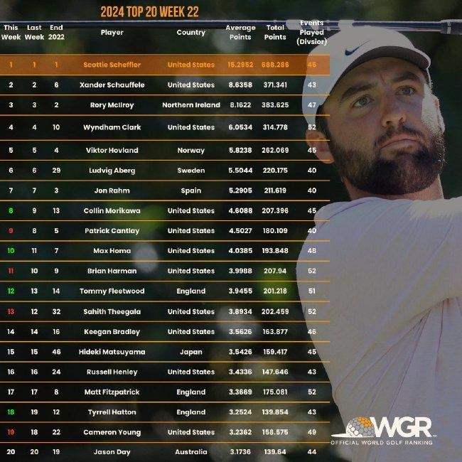 除此之外,馬克斯-霍馬(Max Homa)與英國公開賽冠軍布萊恩-哈曼(Brian Harman)互換座次,盡管兩人上一周也沒有參賽。馬克斯-霍馬在嘉信挑戰(zhàn)賽遭遇淘汰,跌出世界前十,現(xiàn)在又反彈回來,排在第十位。