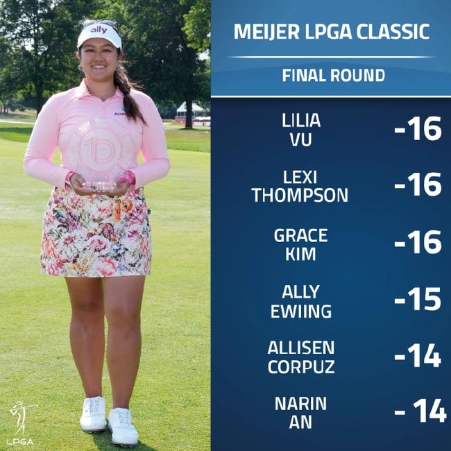 這是三月末福特錦標賽以來,莉利婭-烏第一次參賽。她在第三個加洞——布萊斯菲爾德鄉村俱樂部(Blythefield Country Club)第四洞,五桿洞——推入5英尺小鳥推,終結了萊克西-湯普森實現五年來第一勝的可能,也擊敗了第三輪領先者格蕾絲-金(Grace Kim)。