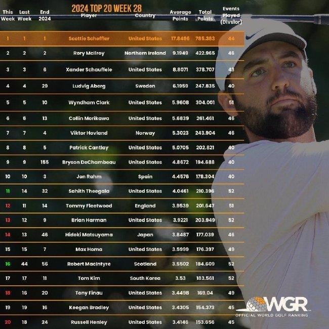 北京時間7月16日,經過上一周的戰斗之后,世界前十位并沒有改變。最引人注目的變化是蘇格蘭人羅伯特-麥金太爾(Robert MacIntyre),他在本土奪冠之后,攀升到生涯峰值16位。