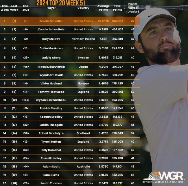 從下降幅度來看,馬特-菲茨帕特里克從第七位下降到第41位,肯定最大,可是瓊-拉姆從穩定位于世界前十之中下滑到25位更引人矚目。當然原因已經重復了多次,他跳槽去LIV高爾夫,那里沒有世界積分。