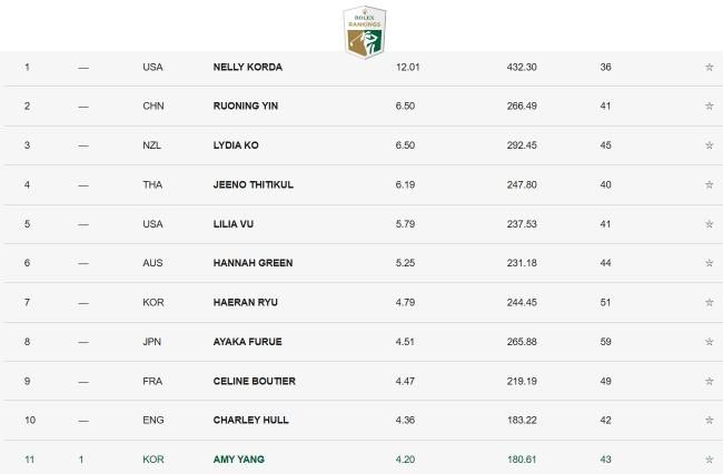 女子世界前十沒有改變。前20位之中,梁熙英與高真榮互換座次,上升到11位。竹田麗央(Rio Takeda)與笹生優(yōu)花(Yuka Saso)互換座次,上升到16位。