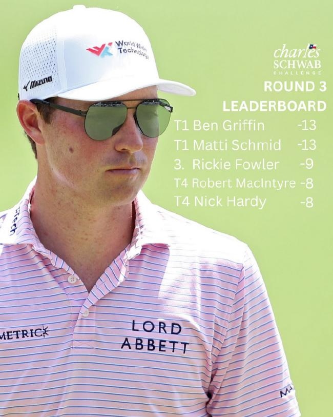 本-格里芬(Ben Griffin)和馬蒂-施密德(Matti Schmid)星期六再度交出相同桿數,以197桿,低于標準桿13桿戰平,帶著4桿優勢進入殖民地鄉村俱樂部最后一輪。不過今天與昨天的情況不一樣,因為世界第一斯科蒂·舍夫勒虎視眈眈緊隨其后,在嘉信挑戰賽第三輪之后攀升到并列第七位。