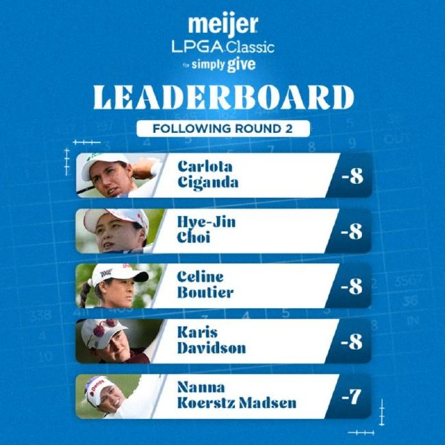 與湯普森并列低于標(biāo)準(zhǔn)桿7桿的還有南娜-馬德森(Nanna Koerstz Madsen,68桿)、阿曼達(dá)-多爾蒂(Amanda Doherty,69桿)、勃朗特-羅(Bronte Law,69桿)、李旻智(70桿)和索菲婭-加西亞(Sofia Garcia,71桿)。