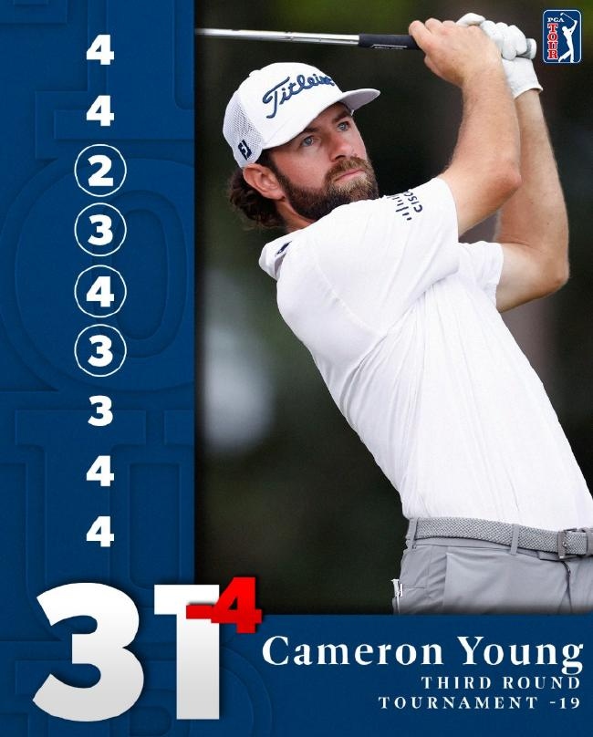 卡梅隆-楊在因暴風雨延遲的第二輪補賽中完成了零柏忌62桿。隨后他在第三輪連續抓到4只小鳥擴大領先優勢,包括在四號洞推進30英尺長推,以及在五號洞,五桿洞從20英尺處兩推抓鳥。他的三輪成績為190桿(63-62-65),低于標準桿20桿。
